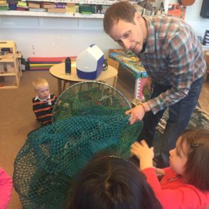 I varied the message to accommodate students between ages 4 and 11. For the younger students we first talked about what seafood they liked before talking about the different methods for ensuring fishermen catch what they’re targeting so they can minimize bycatch. We talked about how a lobster trap works, how videos have shown lobsters can go in and out of these traps at will, and what it means when a lobsterman pulls up a trap filled with black sea bass.