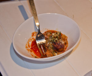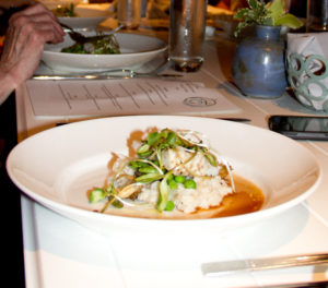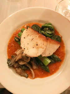 The menu itself testified to the narrative of eating what’s local and fresh. The fourth course was listed as “Local Whitefish al Forno” because Chef Mark prepared the menu not knowing which groundfish Capt. Tim would bring in that day. The pollock, which was fired to the perfect temperature, texture and taste, was served with finnan haddie (cold smoked Finlander haddock) risotto, English peas, fiddlehead ferns, and hen of the woods mushrooms. Stellar.