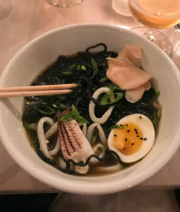 At the dinner, we discussed the importance of eating what’s locally available, abundant and in season. For example, squid are cruising in numbers in the Northeast Atlantic. Chef Mark Segal and his team prepared wood grilled squid (from the F/V Rimrack out of Rye, N.H.) with roasted eggplant, roasted red peppers, crispy smashed chickpeas, olives, pepperoncino, feta, egg breadcrumbs and green crab aqua pazzo. Fabulous. The plates went back to the kitchen scraped clean.