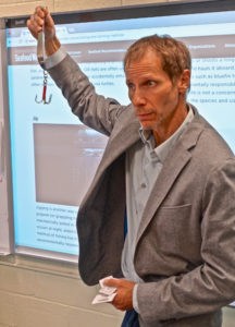 I taught three 5th grade science classes at Rye (NH) Elementary School last week, and took note of students’ interaction with these potentially daunting topics. Typically with classes along the coast, a majority of students raise their hands at the outset when I ask how many like seafood. For those who don’t, I be sure to acknowledge that and tell them that it’s important to understand our relationship to, and impact on the resource, even if we don’t eat it.