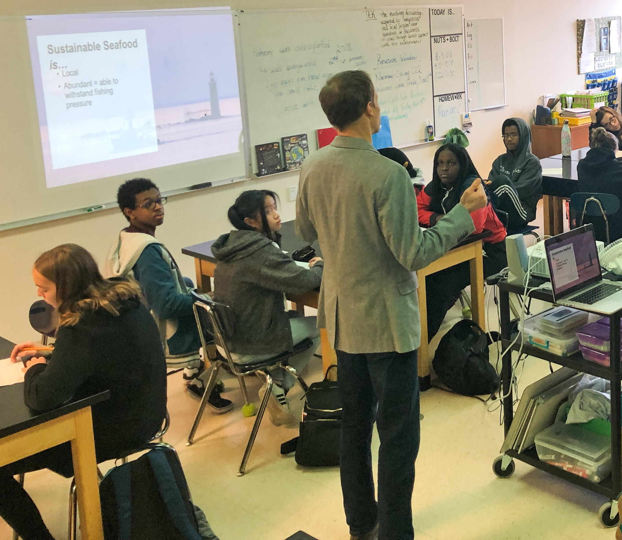 And as we discussed how the fast changing Gulf of Maine affects local species and introduces new invasive species, we also discussed ways the industry is adapting to these changes. Rather than rob students of hope, we talked about our need and ability to adapt to, not solve, climate change and its impact on seafood in the Gulf of Maine.