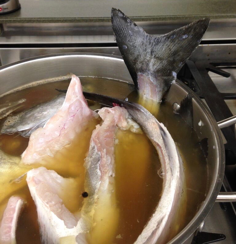 When we fillet whole fish, we put the heads and bones in a pot and cover them with white wine and water. Celery, onion, fennel, and sometimes saffron go into the pot as well, along with some aromatic herbs and peppercorns.
